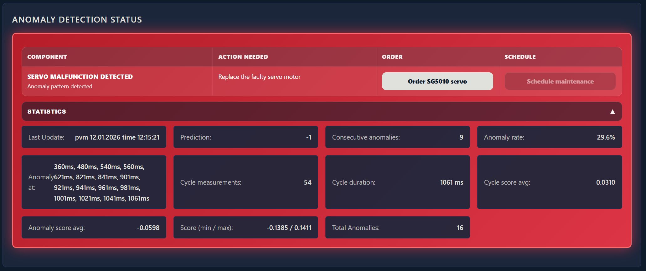 raakadata keskiarvoistettuna ja viimeisimmän servon liikeradan anomaliatunnistuksen tulos.